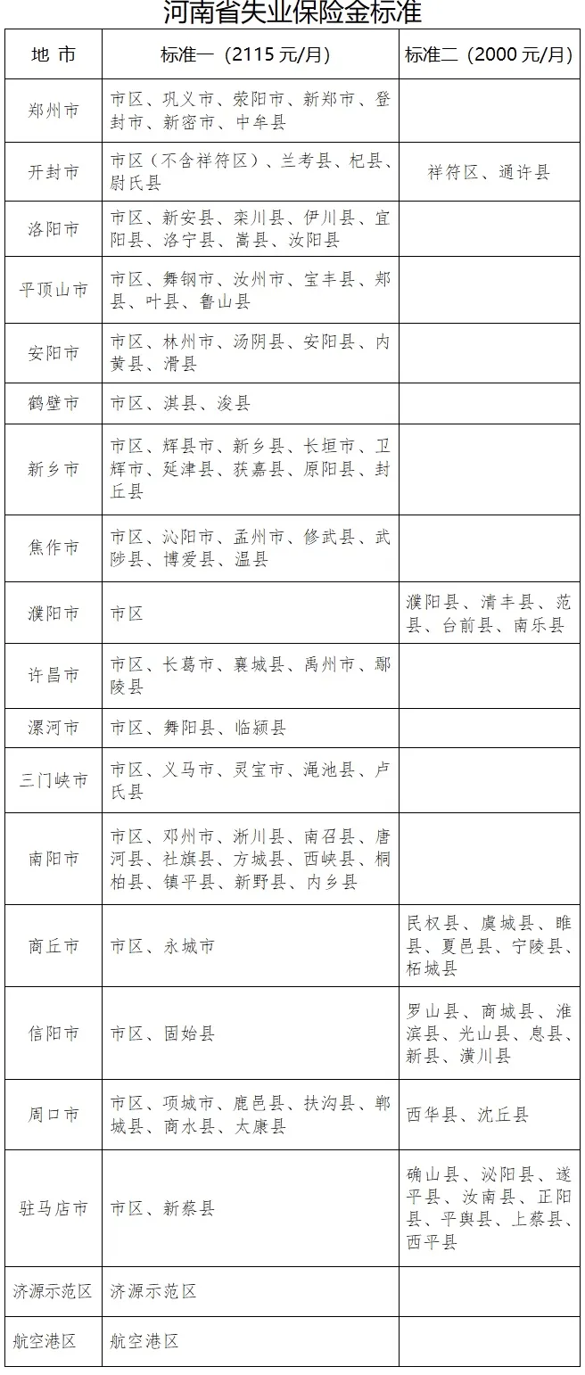 根据通知,失业保险金基本标准按照全省一类行政区域月最低工资标准的百分之九十确定,调整为2115元/月。其中,基本标准高于最低工资标准的三类行政区域,失业保险金标准按照不高于所在地最低工资标准确定,调整为2000元/月。纳入省直统筹的失业保险参保单位,失业保险金标准参照郑州市市区标准执行。调整标准所需资金由失业保险基金列支。